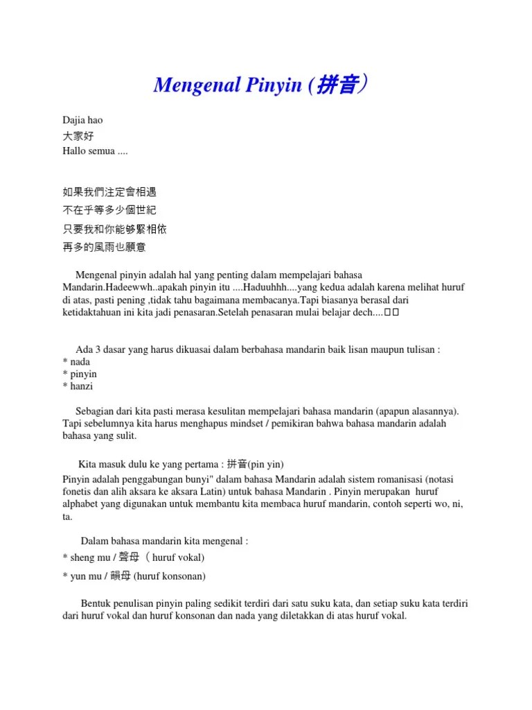 Uniknya, dalam bahasa mandarin, ada dua argumen yang berpendapat bahwa ada 21 dan 23 konsonan dalam sistem hanyu pinyin. Konsonan dalam bahasa mandarin · f, l, m, n, s, w, y · b, dilafalkan seperti huruf 'p' dalam bahasa indonesia contoh: Lafalkan mirip konsonan s, dalam bahasa indonesia, namun dilafalkan dengan badan lidah bukan dengan . Lalu bagaimana cara pelafalan huruf vokal tunggal tersebut? Penjelasan huruf vokal mandarin ; B (po), p (pho), m (mo), f (fo), bibir ;